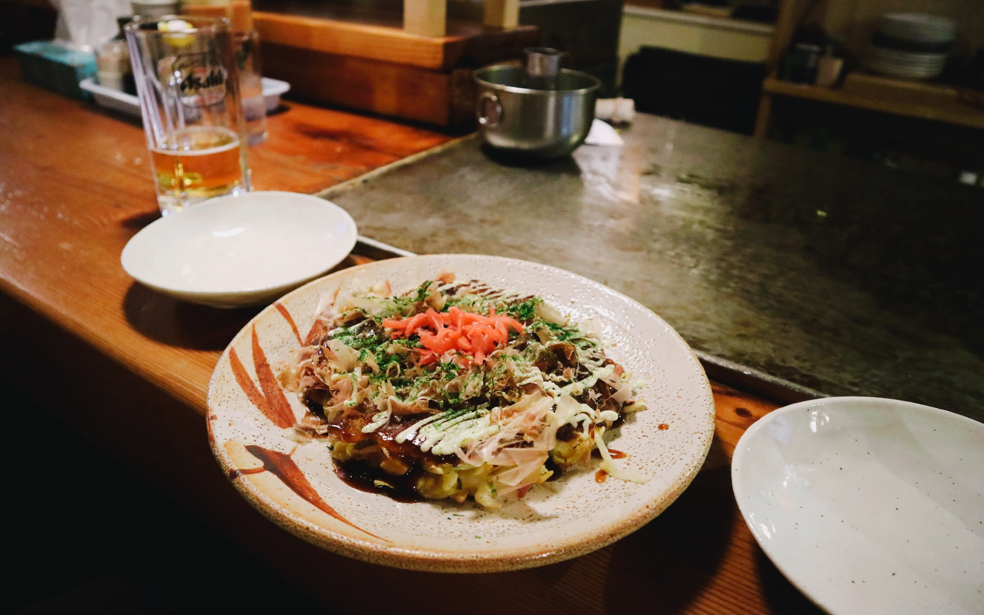 예전 오사카 여행에서 오코노미야끼를 두번씩이나 먹었었는데, 이곳에서도 오코노미야끼를 안먹을 수 없다며 하나 주문하고 생맥주도 주문하였다.