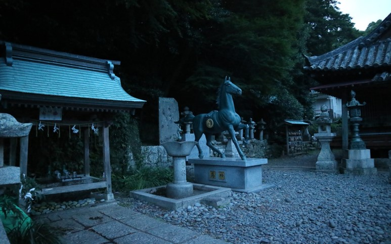 신사의 입구에는 신을 만나기전 손과 입을 씻는 장소 테즈미야가 있었고, 그 옆으로 말로 보이는 동상이 있었다. 말의 신을 형상화 하여 만든 동상이라고 하는데, 이 말 동상에 아픈부위를 문지르면 낫게 된다는 속설도 있다고 한다.