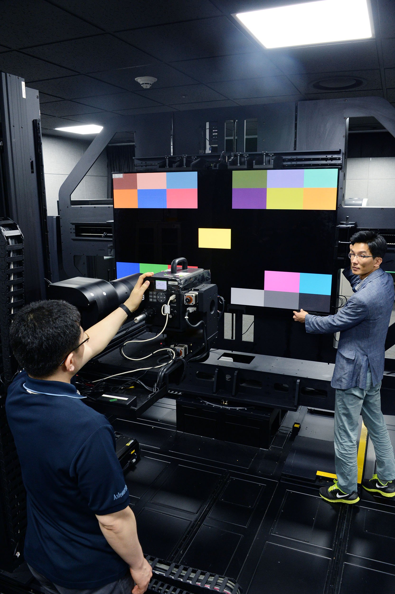 화질 관리하는 곳도 신박하긴 했다. 올레드TV는 소자 하나하나가 스스로 빛을 내기 때문에 어느 각도에서 봐도 높은 수준의 밝기와 색재현율을 자랑한다고 하는데 이 기술을 관리하기 위해서 TV를 기계에 매달아 놓고 여러 각도로 돌리면서 휘도와 색재현율을 측정한다. 무향실이 소리 반사를 다 막았다면 이곳은 모든 빛을 막았다. 빛이 새어나올 수 있는 모든 구멍을 암막커튼으로 막았고 평소엔 스마트폰도 들고 들어갈 수 없다고 한다. 다만 견학 때는 방 조명을 켰다.