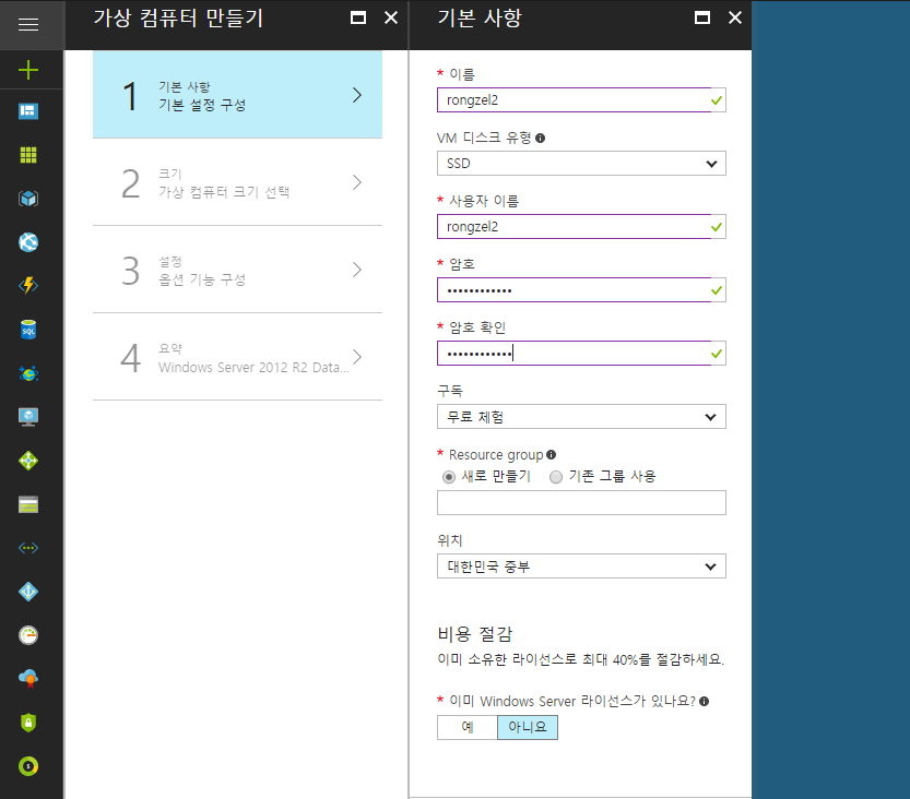 윈도우 서버를 선택 후. 기본사항을 입력해 줍니다..
