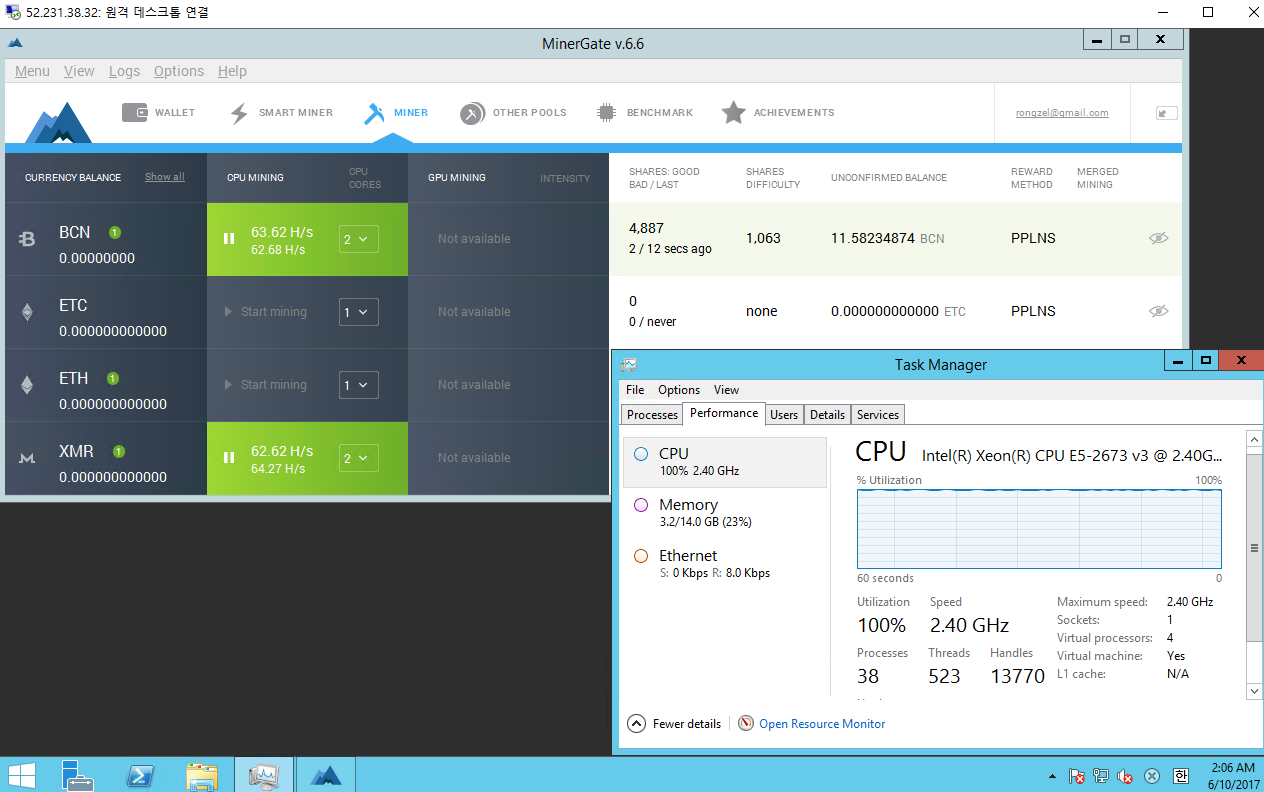(채굴결과 바이트 코인 15개, 모네로 0.02개, 이더리움 0개)