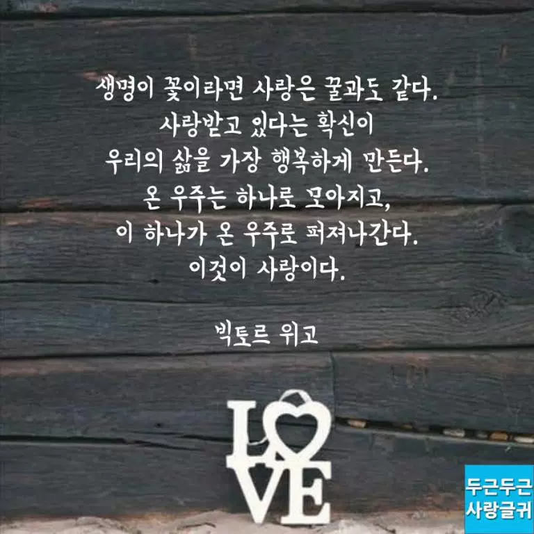 사랑받고 있다는 확신tnbk11 (45)in #kr • 8 years ago 생명이 꽃이라면 사랑은 꿀과도 같다. 사랑받고 있다는 확신이 우리의 삶을 가장 행복하게 만든다. 온 우주는 하나로 모아지고, 이 하나가 온 우주로 퍼져나간다. 이것이 사랑이다. 빅토르 위고 #kr-life #kr-book #kr-newbie