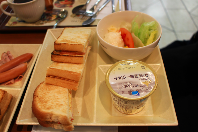 저는 햄, 소시지와 다양한 채소와 토스트가 나오는 메뉴, 여자친구는 이미 다 완성된 샌드위치와 채소 그리고 홋카이도 요거트를 시켰습니다. 어떤 메뉴가 더 좋았을까요? 남에 떡이 더 커보인다고.. 이미 다 완성된 메뉴가 조금 더 간편했던 것 같아요ㅋㅋㅋ 그리고 요거트도 굉장히 맛있었습니다 +_+