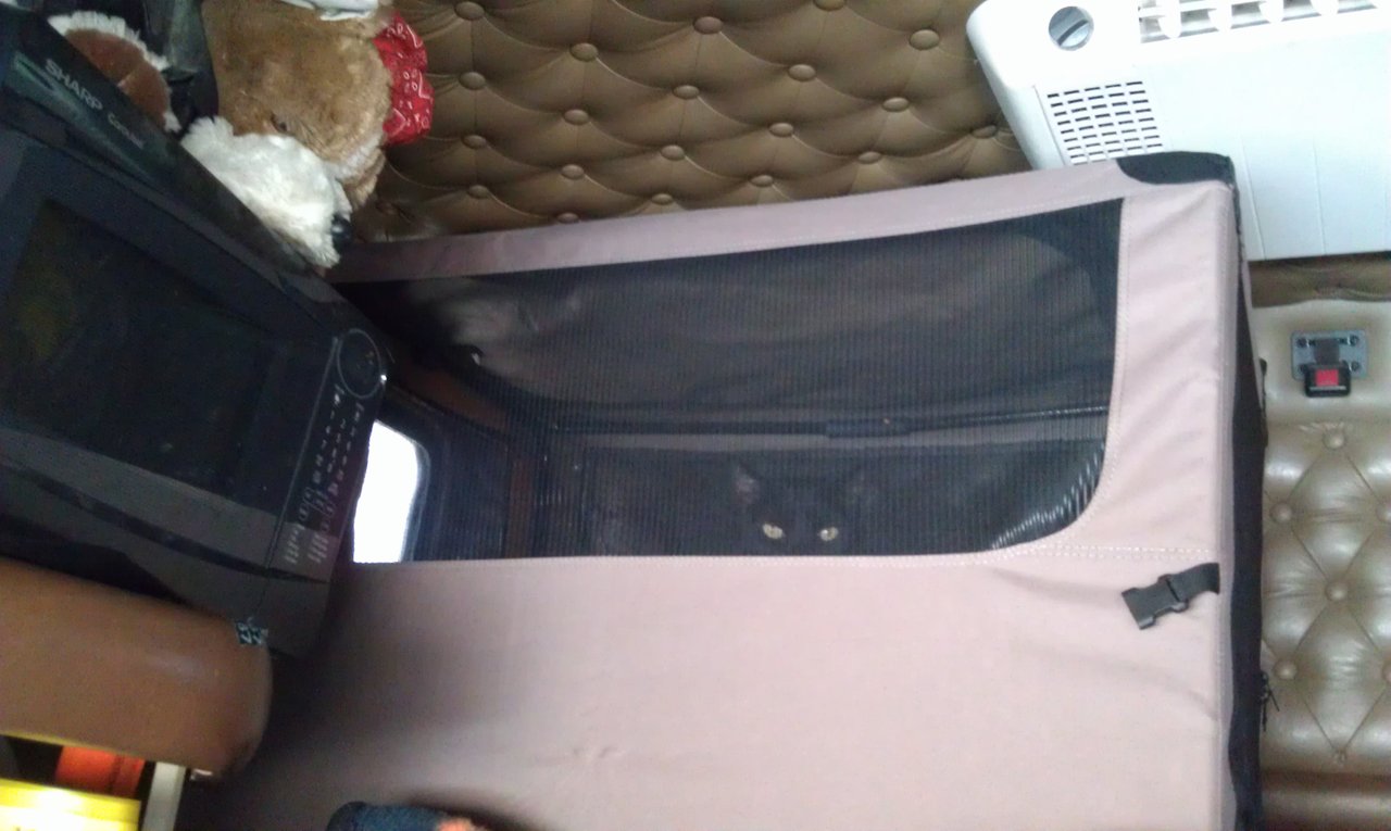 The first night He was in the canvas carrier in the photo, a large 3' x 3' enclosure. He was not happy, very vocal, and could shred it at any moment if He wanted to. I had to do something different, it was going to be a 4-5 day trip to our home in Florida.