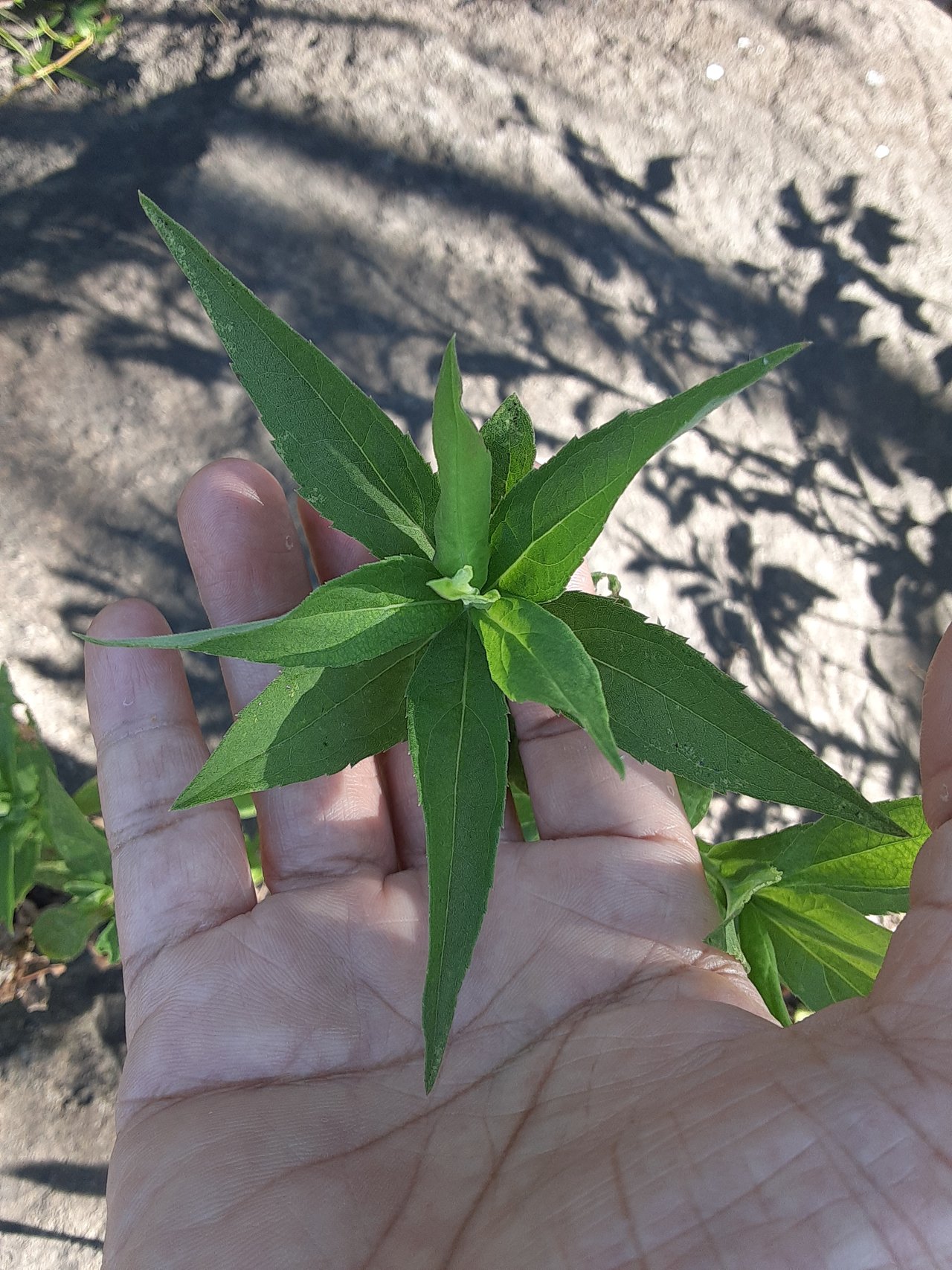The leaves are lanceolate to ovate, 3-6 inches long and 0.8-2 inches wide, with smooth or toothed edges. The upper surface of the leaves is rough and scabrous, while the underside is hairy. The leaves are arranged alternately on the stem, with the lower leaves being opposite.