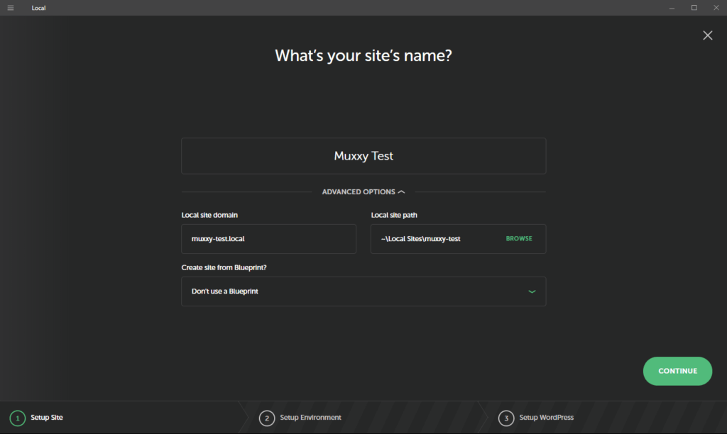 Give your site a name and, unless you really need to, leave the next two options on their defaults. Once you create blueprints, it's at this point that you can use one to base your new site off. Click 'continue'.