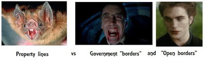 Claiming that makes me for "open borders" is like saying that because I don't believe in bloody Christopher Lee vampires I must only believe in Twilight's sparkle-boy vampires. No, all those vampires are fictional. Instead of believing in either of them I believe in vampire bats-- the real vampires. Yes, these real vampires gorge on blood, but they aren't otherwise very similar to the fictional vampires.