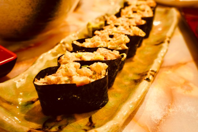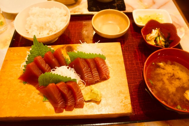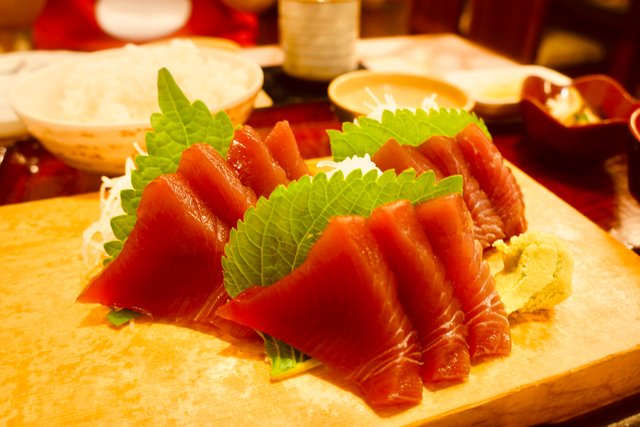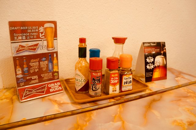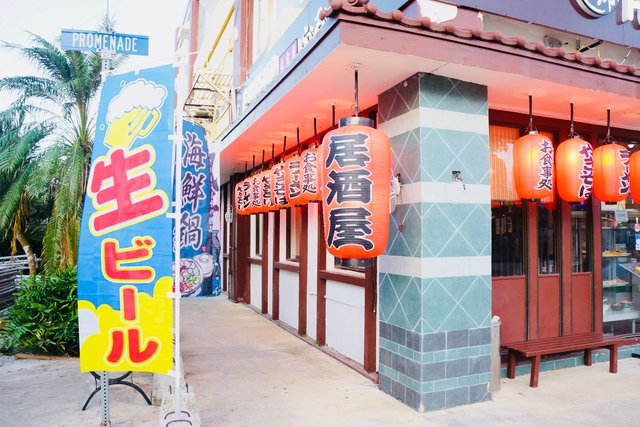 我们就在某一个晚上走进了一家看上去非常地道的日本料理店。从门外的装修就看得出这家店应该是为来岛上的日本客人开的,因为它太日本了,跟我们去日本本土见到的餐厅一样一样的,内里的装饰风格也很日式,墙上花里胡哨地画着各种菜式。