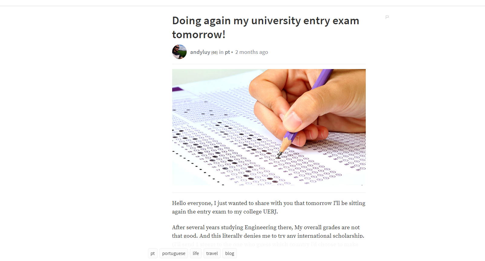 I'm @andyluy a Brazilian jobless college student, freshman at cryptocurrencies who live in Rio de Janeiro, love to make new friends , travel around the world, having adventures and believe that steemit can help me to gather 20,000 $ to realize my life dream to study in Japan!