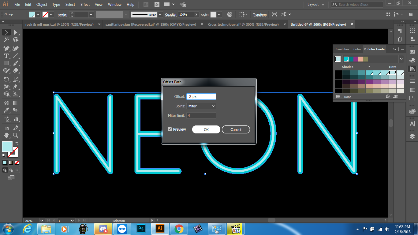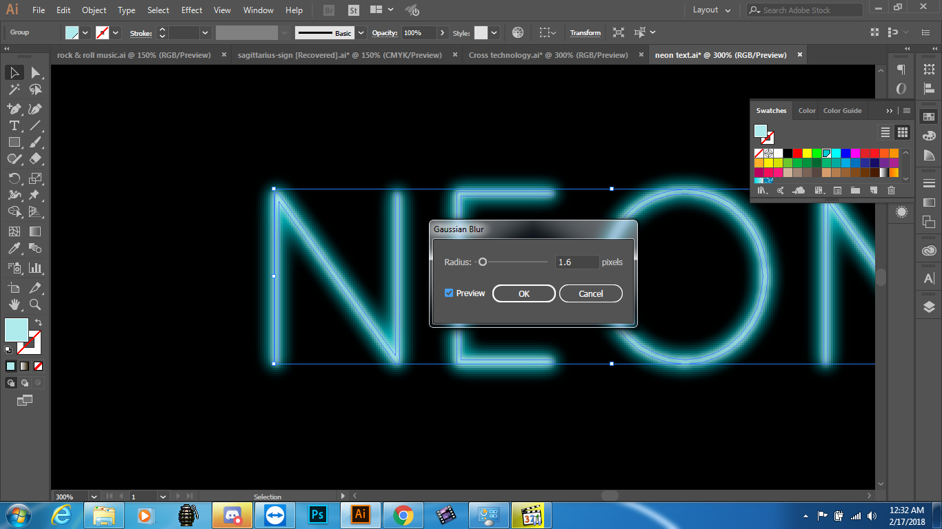 ** You can the see that there is three copy of the Neon text that you have created so far to complete the whole effect. You just go to the Swatches and change the color of the text then the whole three color text are change**.