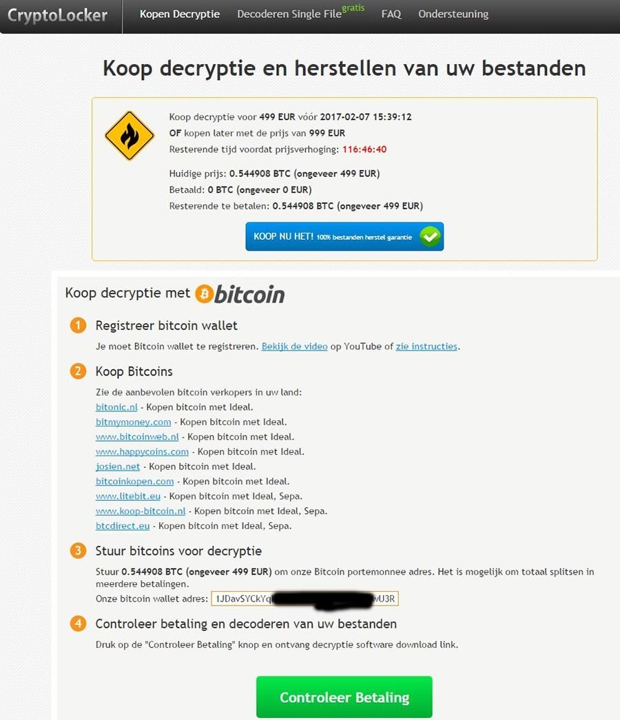 First of all, I am impressed it’s completely in Dutch. Second, it gives good instruction what to do and where to pay. It threatens to raise the ransom-price after 116 hours and they made a big green button at the bottom that will probably do something the moment the Bitcoin arrive on the provided address.