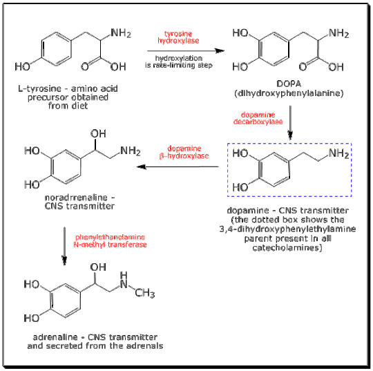 The pathway for the production of these neurotransmitters are shown in the diagram below