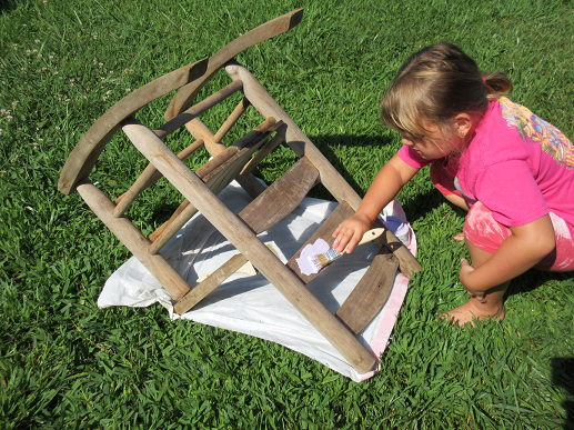 We didn't have any sandpaper, so we used steel wool to give the chair a light sanding. I had my daughter do most of the work on this project, to include the sanding.