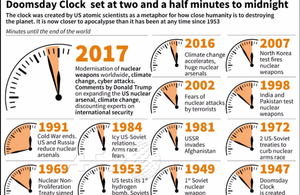 Годом ранее стрелки часов впервые в истории передвинули на 30 секунд ближе к полуночи. Решение было отчасти принято «на основе слов одного человека — Дональда Трампа, нового президента США». В январе 2016 года стрелки часов не двигали вовсе, в январе 2015 года их перевели с пяти минут до трех минут до полуночи.