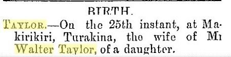 Birth announcements in the newspaper can be a source of information or a source of frustration as this New Zealand one for Margery July Ann TAYLOR shows. (1871)