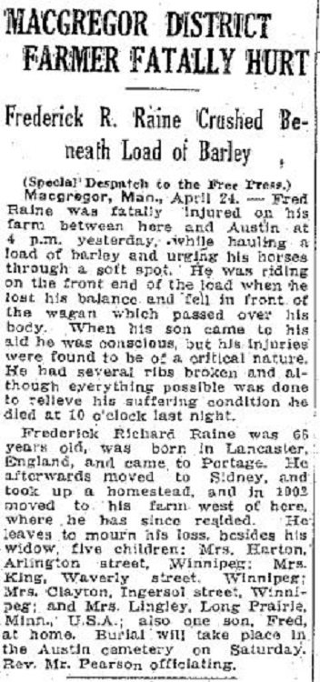 Newspapers also print articles or notices on someone if they were deemed newsworthy - such as being involved in an accident or fatality. This one, from Canada, is for Frederick Richard RAINE. (Apr 1924)