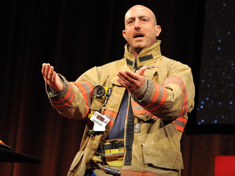 The volunteer firefighter, Mark Bissus, speaks of heroic behavior he has done.