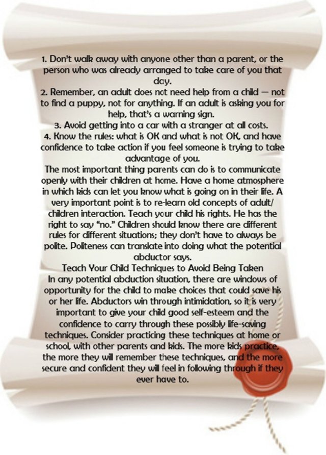 I believe it is important to teach children how to avoid being seized, how to resist a potential captor and how to escape. Kids are vulnerable and trusting, and it is our job as parents to remind them of basic safety rules, including:
