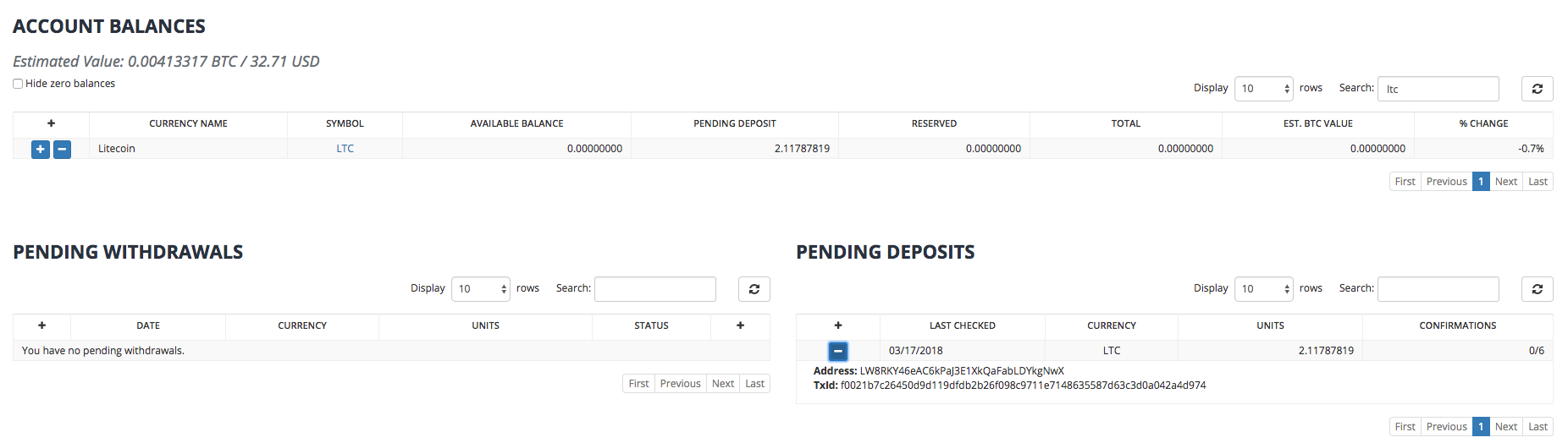 Below is a screenshot of my Bittrex wallet where you can see that tehre’s still a pending LTC transaction:
