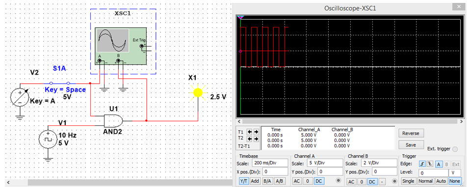 Suppose we want to test an AND Gate. We can use 1 Clock and a Constant Source that has a Switch. We could also use 2 Clocks, where one has half or double the frequency of the other so that we end up with all combinations. But, I will stick with the first one.