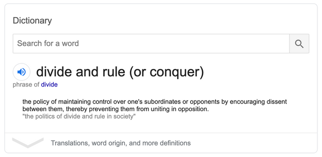 Just thought "divide and conquer" was missing from terms often used to describe logical fallacies. It differs from usual logical fallacies in that it is used to control a herd narrative, not just in conversation between two people.