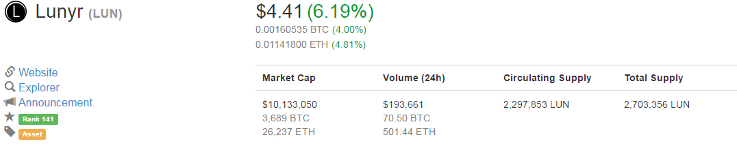 As this project has massive potential to be a game changer on the web and possible bringing the blockchain closer to the mainstream, I think the current price is way undervalued. But considering the lack of communication it's fair that investors are holding back and wait for more information on the progress. The total marketcap of Lunyr is currently a small 10 million dollars bringing the price per LUN at $4.41. This is the price without any update and product. The only thing available for now is just the white paper and the tokens. However, the price has been stable with a low of ~$2,50 at a certain point but I expect the price to not reach that point anymore. The price have since climbed steady to the $3 and $4 range with a peak on $5.60. As mentioned before, the price is expected to move in the coming days as the team announced to give some updates.