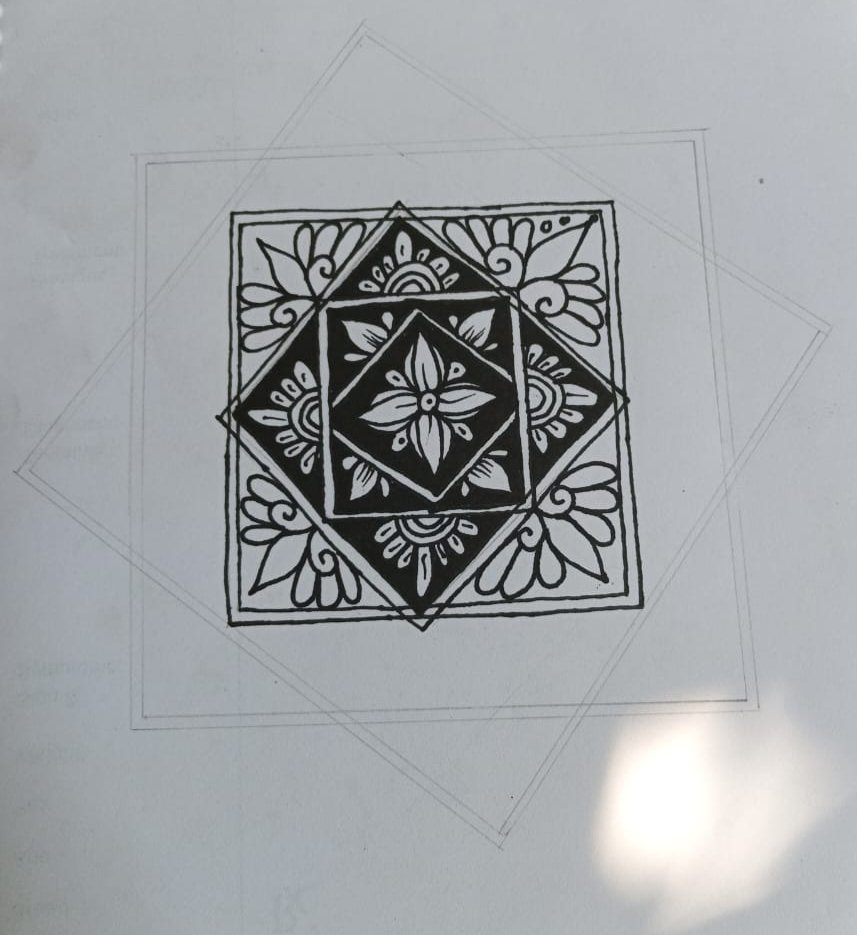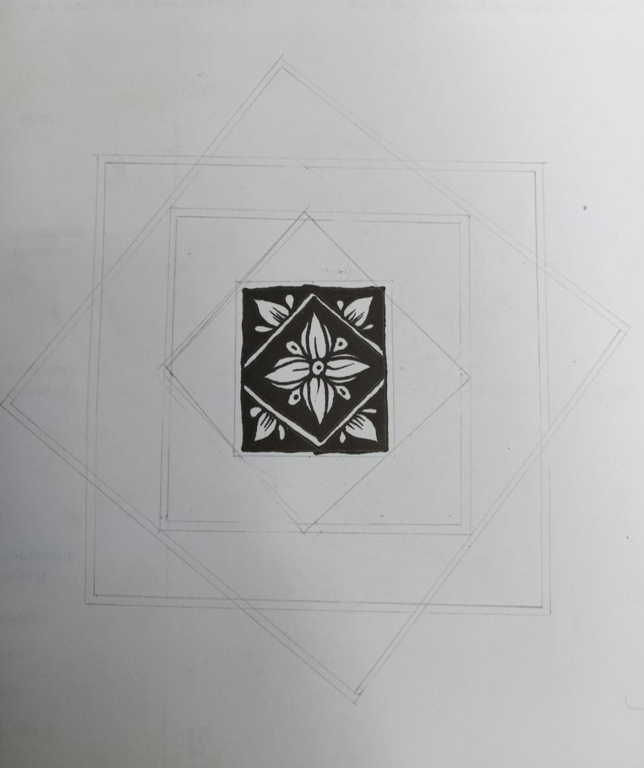 - এখন আমি ডিজাইন করা আরম্ভ করছি। তাই প্রথমে মার্কার কলম দিয়ে বক্স এঁকে নিলাম। তারপর বক্সের ভিতরে একটি ফুল এঁকে নিলাম।