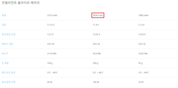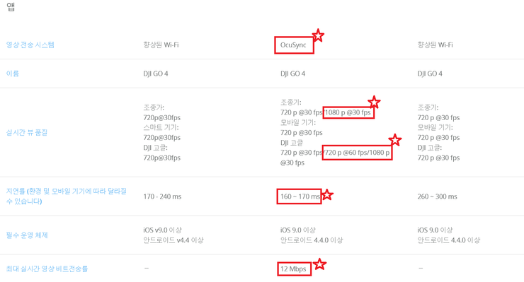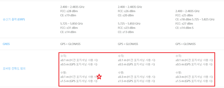 DJI 홈페이상의 공식 스펙 화면에서 관심을 가지고 보아야 할 부분을 표시해 보았습니다.