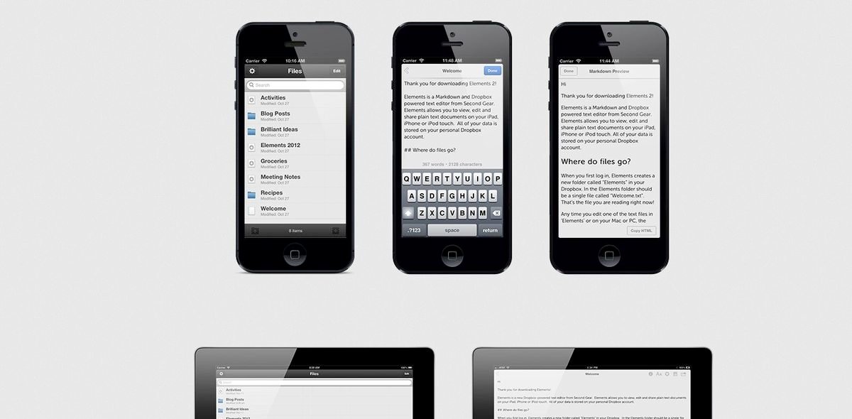 Elements is a beautiful, versatile text editor for iOS, which allows you to view, edit and share plain text documents with the data stored in your Dropbox account. You can create, view, edit and preview Markdown and MultiMarkdown files. It also features offline support, auto-saving, and word, line and character counts.