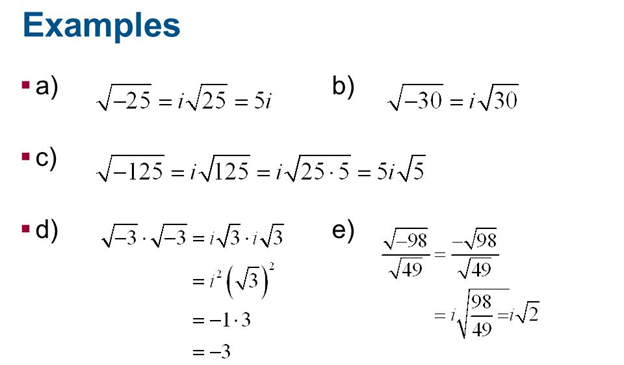 How will you solve something like that? When you calcu it, the calculator will probably just say "MATH ERROR". But it really has an answer; in the form of complex number ( 0 +5i or 5i ). A complex number is in the form of x +yi. Where "x and y" are real numbers and "i" is = sqrt(-1), so that "yi" is imaginary unless y=0.