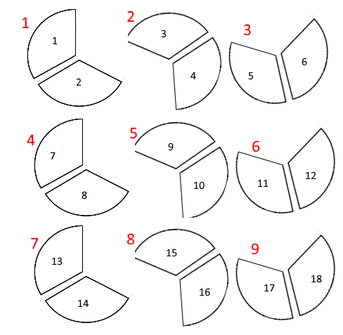 I've numbered the halves in black so it's easy to keep track of how many there are, as well as numbering the groups in red.