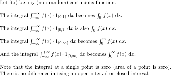 Note that the integral at a single point is zero (area of a point is zero). There is no difference in using an open interval or closed interval.