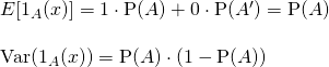 Since the indicator function is a random variable, we can find the expected value and the variance of it. The P(A) notation stands for the probability of outcomes in set A occurring.