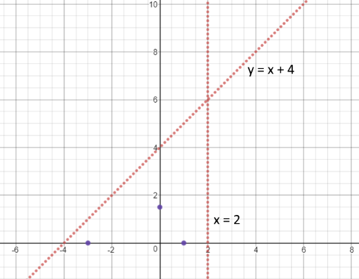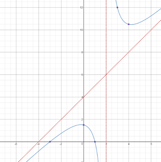 Step 2: Find the asympotes. In this case, there is an asymptote at x = 2. Also, since the P(x) is quadratic, and Q(x) is linear, there is an oblique asymptote. Dividing the polynomials gives x + 4 with a remainder of 5, so the oblique asymptote is x + 4. Therefore, we add x = 2 and y = x + 4 to the graph.