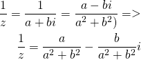 Everytime i is in the denominator, like in the divisions of above, we multiply the numerator and denominator with the conjugate of the denominator (more about that later on). For z1/z2 with (c - di) and for 1/z with (a - bi).