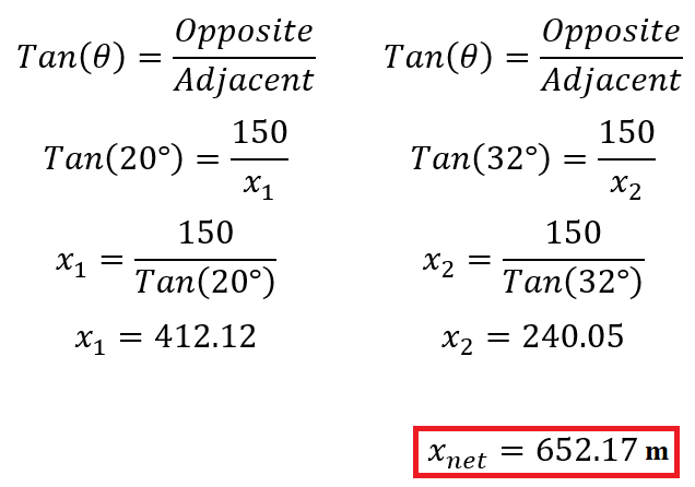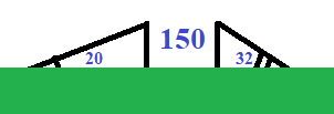 A hot air balloon is floating 150 meters in the air. Two adjacent observers are watching the balloon rise from angles of elevation of 20° and 32°. How far apart are the observers from each other (in meters).