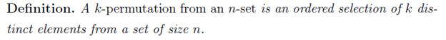 A permutation of an n-set is an ordered n-tuple where each entry is a distinct element of the n-set.