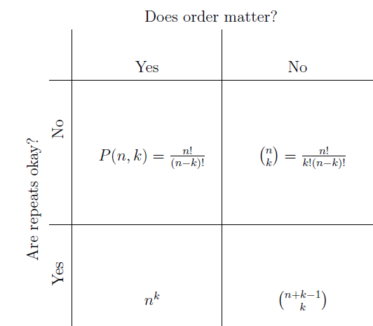 Now that we’ve completely explored all the types of possible counting restrictions we can produce, our table of counting formulas is as follows. (We’ll shift from the old notation to a new notation on the k-combination