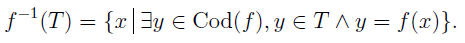If T is a subset of Rng(f) then the preimage of the set T under f is denoted