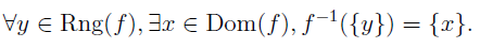 - A function f is injective ff the inverse images of singletons are always singletons. That is,