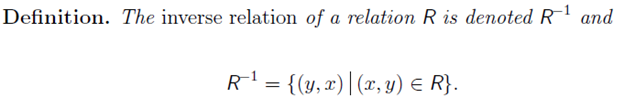 One can define an inverse for any relation; the inverse is formed by simply exchanging the elements in the ordered pairs that make up R.