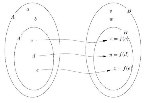 Note, that not all values can serve as an input of a function (e.g. square root of a negative), similarly some outputs are not possible. Thus in dealing with a function as a relation contained in , there are actually four sets that are of interest – the sets A and B and some sets which we will denote by A’ and B’.