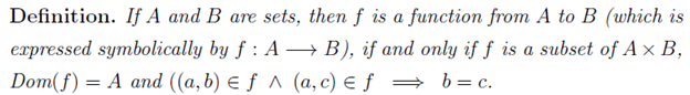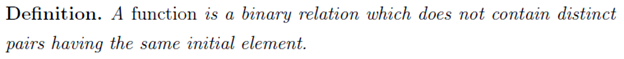 We now have an idea that functions are just special classes of relations; it is natural to say that function is just a set of ordered pairs. Basically, the function is tied up to the rules that give the output and the type of input given.