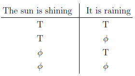 Our atomic predicates are: “The sun is shining” and “It is raining”, which can be true or false independently of one another.