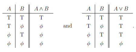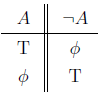 Look at the table below were we have introduced a convention – T indicate a true statement, while Greek letter phi indicates a false statement.
