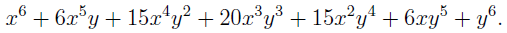 It took us a lot of work to reach this answer. Now, look at the answer above, the exponents on x starts at 6 and descends with each successive term down to 0. The same line of pattern holds for y but this time starting on the right side. Interestingly, the coefficients we have shown are actually the sixth row of the Pascal’s triangle.