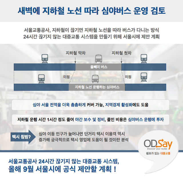 김태호 교통공사 사장은 “지하철이 끊기면 지하철 노선을 따라 버스가 다니는 방식으로 24시간 끊기지 않는 대중교통 시스템을 서울에 만드는 것이 이제 필요하다”며 이런 시스템 도입을 2년여간 연구용역을 통해 검토했더니 타당성이 있다는 결과를 얻었다”고 말했습니다.