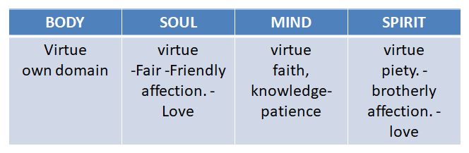 Once we put virtue in each of the components of our being, "Spirit, Soul, Mind and Body" we can begin to dominate the body, prepare the mind and let the Spirit rule our spirit in our soul, for the love of God.