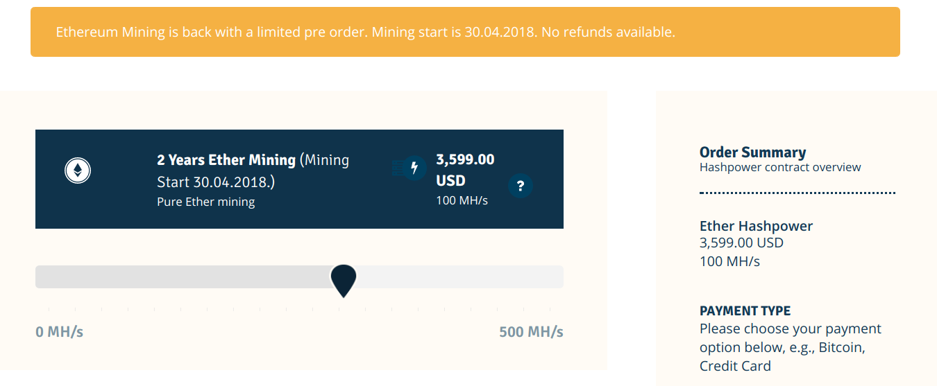 最有名的雲端挖礦公司Genesis Mining,在上次釋出比特幣合約被秒殺之後終於又堆出新的合約啦~ 雖然只有ETH的合約,而且是兩年期限,但是我個人其實對ETH的信仰是大於BTC很多的,所以當然要加碼一下,打造被動收入啦!
