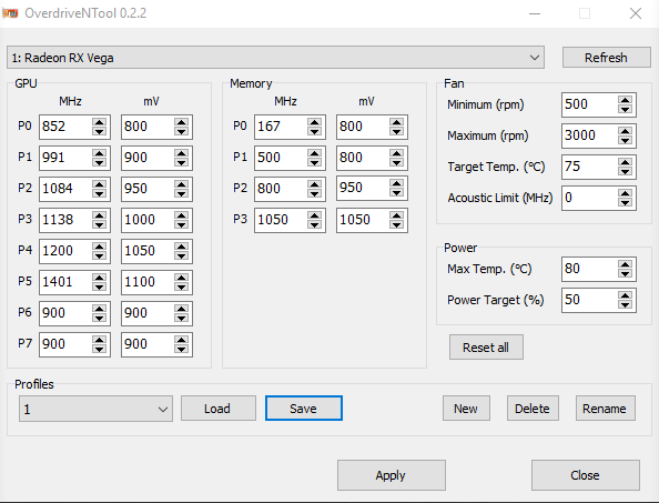 Open OverdriveNTool and you'll be greeted with this window. If you have a Vega 56 that has been flashed with Vega 64 BIOS, than you can match your numbers with mine, click save, and you should be stable. Those with Real Vega 64 cards can probably get better memory clocks, but you should be fine with the same numbers. Everything here is based on my own testing, so it's more a guideline and less of an exact science; silicon lottery and all that.